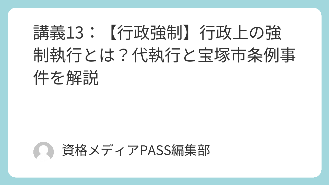 特に「代執行(だいしっこう)」は、行政書士試験で毎年と言っていいほど出題される超重要テーマです。また、「行政は裁判を使えるのか?」という論点(宝塚市条例事件)も記述式対策として必須です。