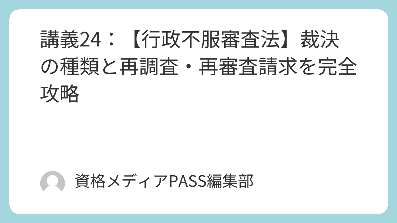 今回の講義では、審査請求のゴールである「裁決の種類・効力」と、例外的な不服申立て制度、そして第三者機関である「行政不服審査会」の役割について解説します。
