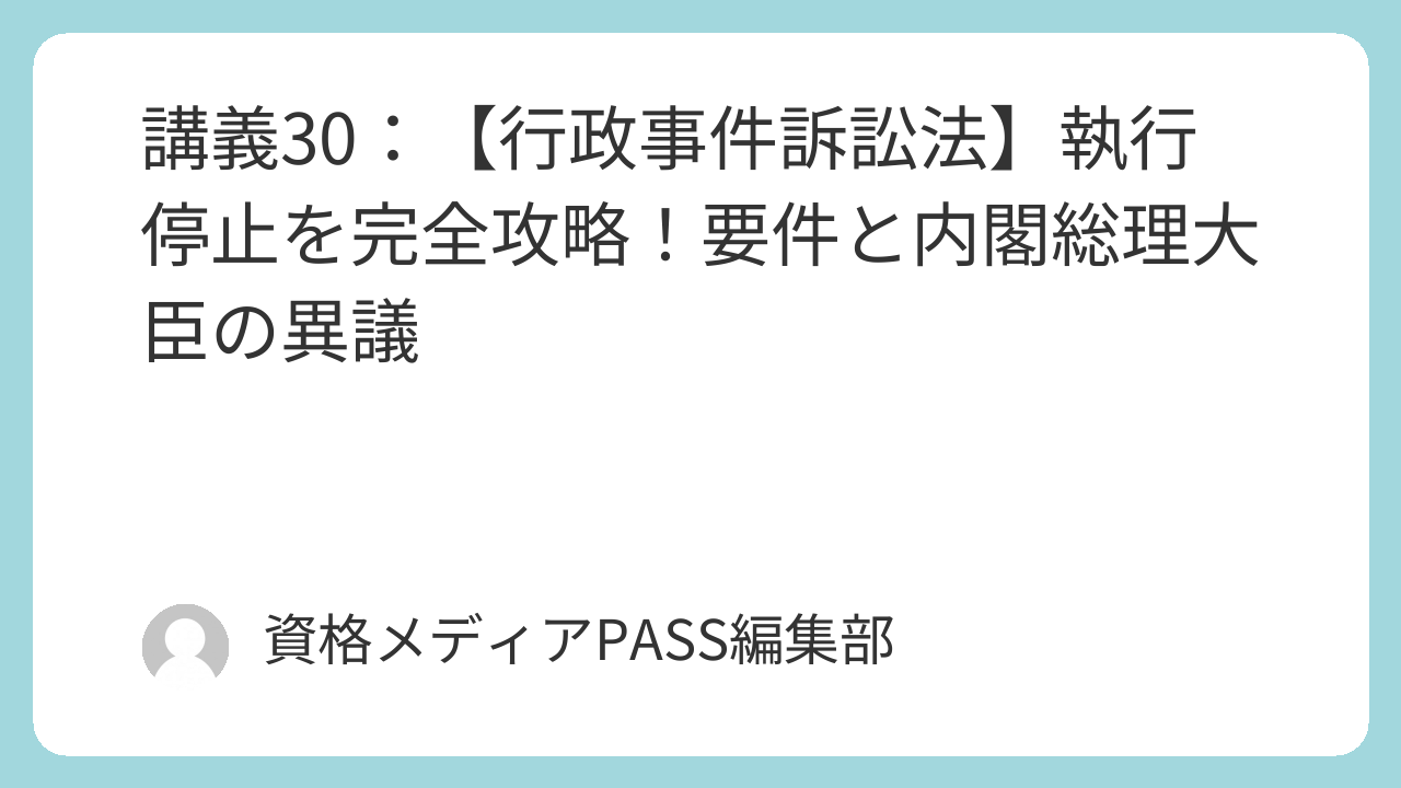 今回の講義では、受験生が行政不服審査法と混同しやすい「執行停止の要件・手続」や、行政法独自のユニークな制度である「内閣総理大臣の異議」について、徹底的に解説します。