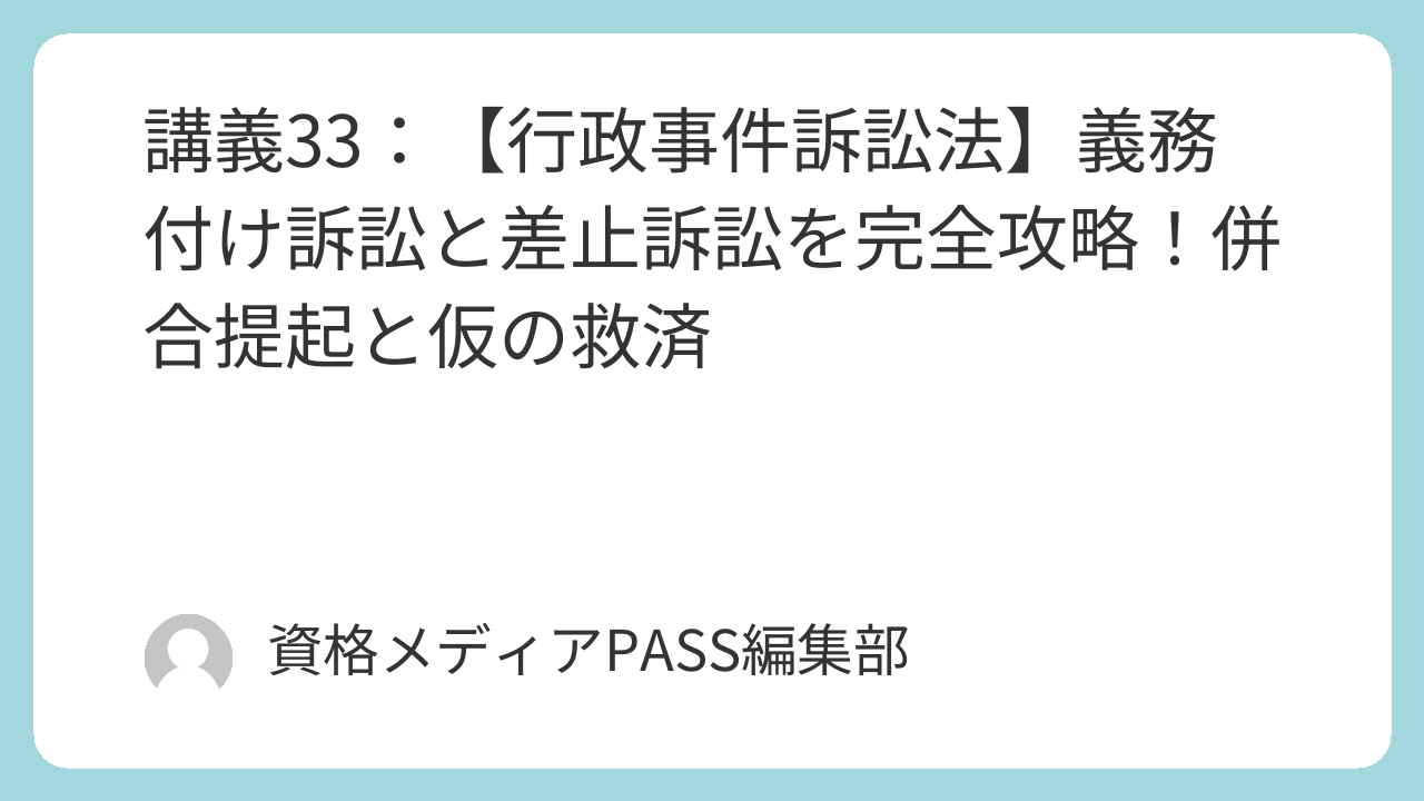 今回の講義では、行政庁に積極的なアクションを求める「義務付け訴訟」と、ブレーキをかける「差止訴訟」、そして緊急時の「仮の救済」について、体系的に解説します。