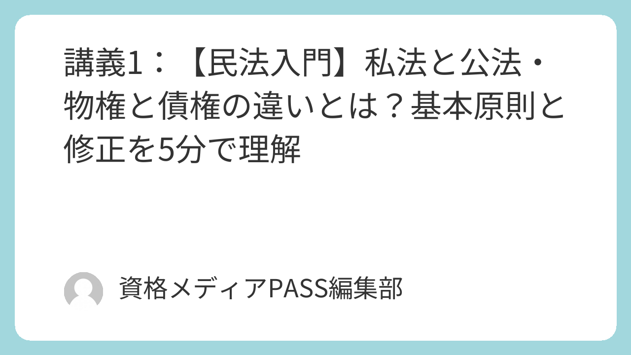- 物権と債権:物に対する権利(物権)と、人に対する権利(債権)の違いは、今後の学習の全ての基礎になります。