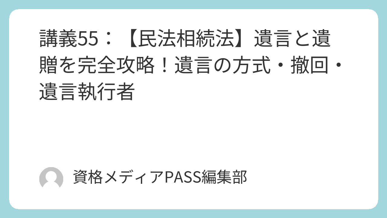 - 遺言の方式:自筆証書遺言の「財産目録の特例(自書不要だが毎葉に署名押印)」は近年の法改正ポイントであり頻出です。